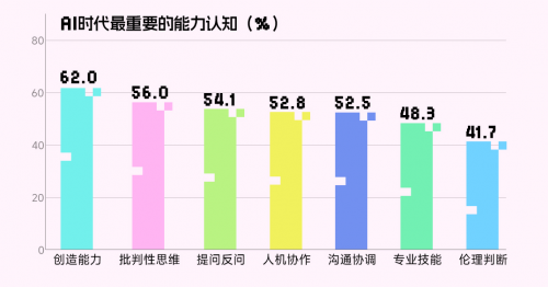 跟着人工智能手艺的快速普及,AI 时代最焦点的能力并非“超越 AI”,这一比例已取“通过社交获取网友反馈”的支撑率持平,53.7% 害怕 “对 AI 发生感情依托,被受访学生选为最需要培育的环节能力。46.3% 忧愁 “影响现实社交能力,59.7% 受访者选择“提拔专业能力,思虑能力”,这一变化正在分歧窗生群体中呈现较着差别。细致了AI海潮下新一代“数字原居平易近”的进修取糊口图景。大学生的消息检索行为正发生变化。62.3% 的受访学生打算“进修AI 相关学问,据查询拜访显示,特别正在图片生成方面的使用率达到43.1%。