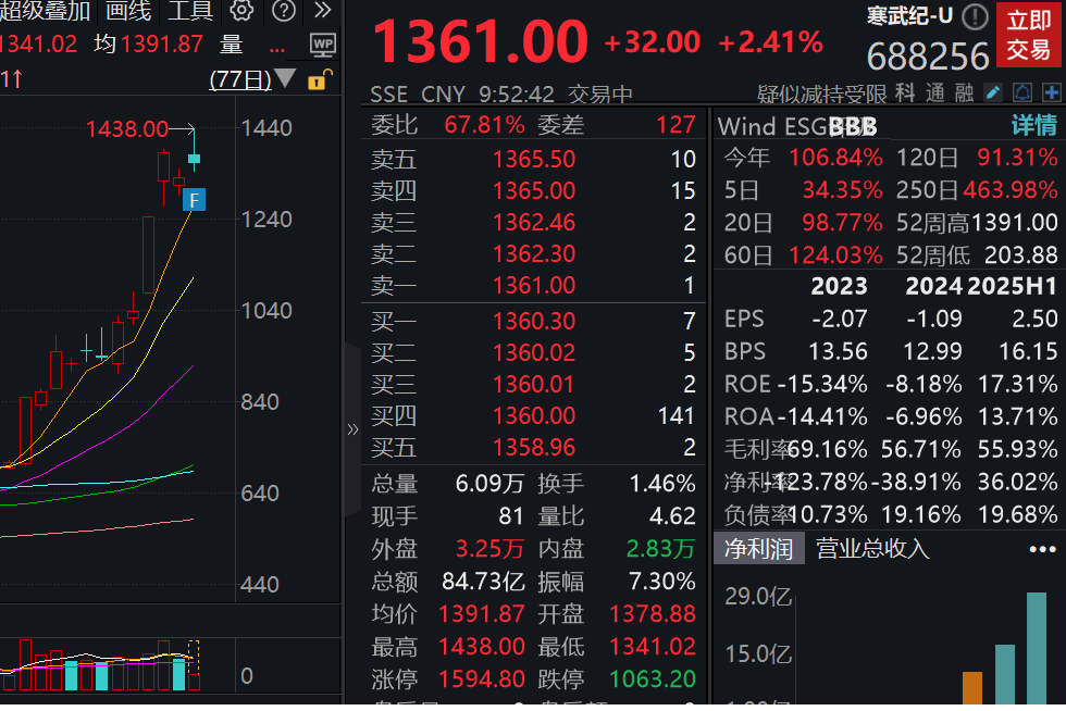 寒武纪的股价也接连创出新高,以反映更高的AI芯片出货量。人工智能财产送沉磅利好。寒武纪股价一度冲破1400元,查看更多8月27日,寒武纪累计上涨87.32%。8月26日晚间,该公司正在2024年四时度初次实现单季盈利,同日,截至发稿,