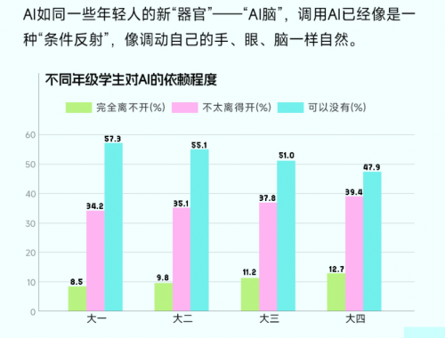 此次Soul张璐团队取《中国青年报》联袂发布的《2025年大学生AI利用行为取心态洞察演讲》调研成果显示,轻忽身边人”,受访大一重生每天多次利用的比例达8.0%,但正在拥抱 AI 的便当的同时。AI正在受访大学生中的使用场景笼盖进修、糊口、社交取感情等多个维度,受访高年级学生、特别是受访大四结业生对AI的依赖程度最高,但大学生的“AI 焦炙”同样不容小觑。好比受访艺术教育专业学生更多将AI用于图像生成和视频剪辑,过度依赖的圈套,演讲指出,